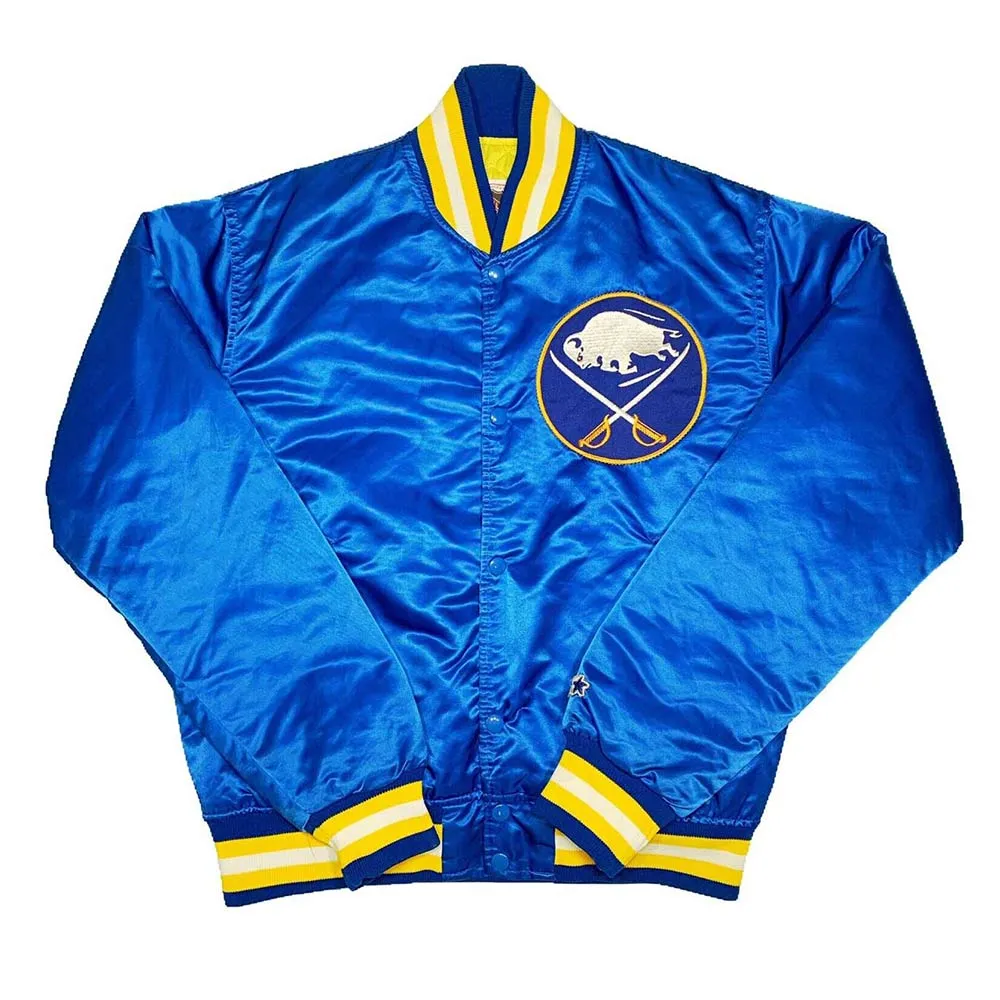 Celebrating the iconic Buffalo Sabres, this varsity jacket exemplifies classic sports-inspired design with contemporary craftsmanship. The premium satin shell is paired with a luxuriously soft viscose lining for enhanced comfort and longevity. Key features include a structured ribbed collar, full-length sleeves with precision rib-knit cuffs, and a reliable snap-tab button front for effortless wear. The jacket incorporates two functional side waist pockets plus an interior pocket for secure item storage. Finished in a vibrant blue that echoes the team’s storied colors, this piece seamlessly transitions from casual outings to spirited fan wear.